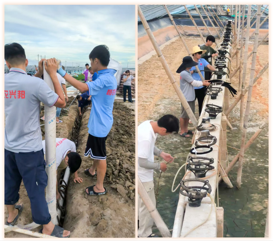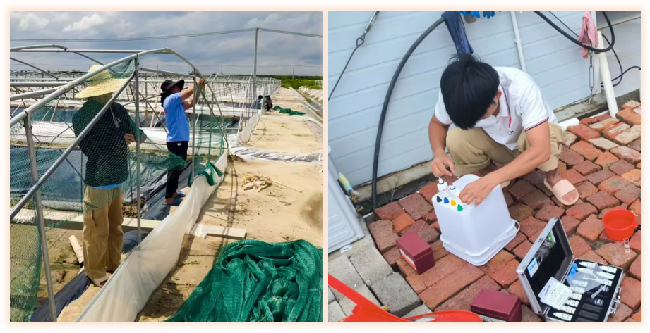 台风过境后,多地养殖区一片狼藉:棚舍坍塌、塘基损毁、雨水积涝、鱼虾应激……在陈丹董事长指示下,恒兴技术服务团队迅速联系受灾养殖户了解损失情况,并分组赶赴各受灾区域,及时为养户进行水体、鱼虾健康检测,协助开展排水清淤、修补棚舍等工作,全面检修地膜、进出水管、电路及机房设施。